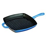 Cast from molten iron in individual sand molds and coated with porcelain enamel, this 10 inch square grill pan is perfect for grilling your favorite meats and sandwiches. The ribs insure that food does not sit in grease so it's low fat cooking too. Use to sear, grill prepare panini sandwiches. The Lodge Color Square Panini Press is the ultimate companion to this ribbed Grill Pan. Cast iron has superior heat retention so it reduces the amount of energy needed for cooking. The Lodge Color Porcelain Enamel showcases vivid color and with ease of cleaning and resistance to abrasion. It's also stain resistant. The Cooking surface is matte black enamel. Caribbean Blue color. Read more