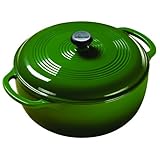 The 6 Quart enamel Dutch oven is great for cooking, marinating, and freezing. Lodge color porcelain enamel on cast iron cookware is cast from molten iron in individual sand molds. The porcelain surface eliminates the need to season cast iron. The cast iron vessel has superior heat distribution and retention, evenly heating bottom, sidewalls, and even the lid. Two layers of very hard, glossy porcelain enamel are chip resistant and easy to clean. Hygienic porcelain enamel is non-reactive with food. Knob is oven safe to 400 degrees. Tightly fitting lid seals in moisture and the excellent heat retention reduces the amount of energy needed for cooking. Hand washing with warm soapy water is recommended to preserve the cookware's original appearance. 10 3/4" diameter, 4 1/2" deep. Emerald green Read more